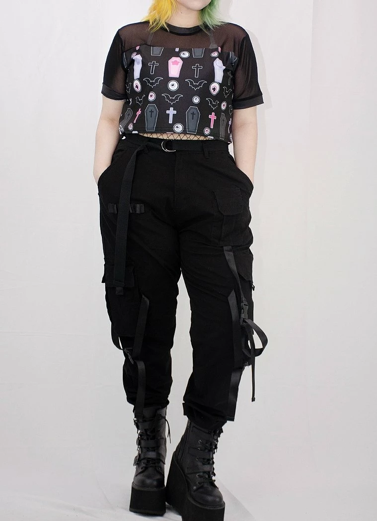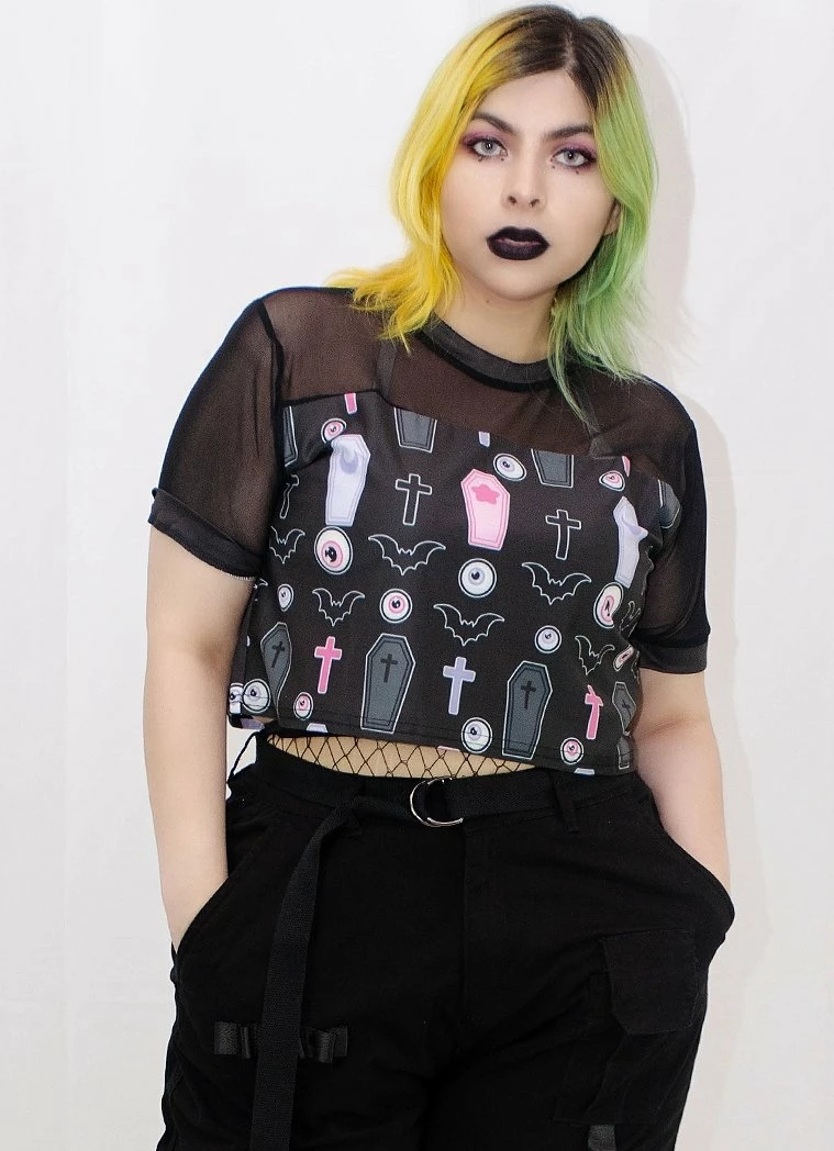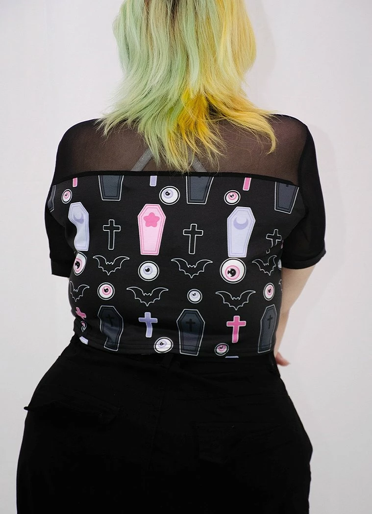 Get this Black Crop Top right now and start your pastel goth trend today, who knows what else you can get from In Control Clothing in the future. Choose this fun pastel goth crop top over any other affordable cute crop tops. Not only is it super affordable, but it features a stylish mesh design on the shoulder area that makes it even more unique. Wear it to school, a party, or just to hang out with friends – all eyes will be on you! Hashtag