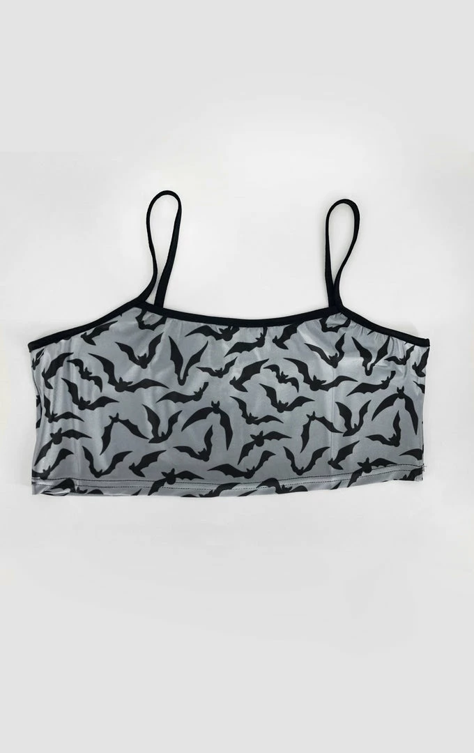 Grey Bat Cami Crop Top Is made of soft elastic material, stretchy and comfy. This crop top features a bat pattern, solid grey coloring, and Spooky cool Look. Pair it with some black spandex leggings for a creepy cute outfit!