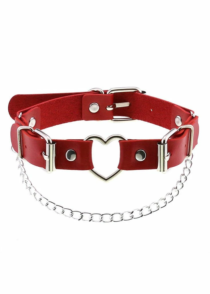 These Cherry Red Heart Strap Chain Detail Choker Necklace is super cute for a contrast statement. A Pop of color to a dark outfit.