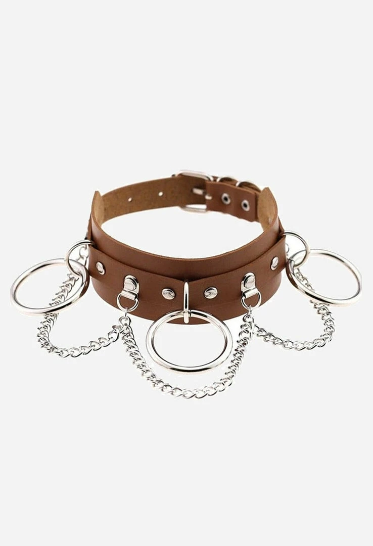 The earthy spirit choker necklace is brown in color with an o-ring detail and comes with chains across the choker necklace. The chains are design to add a little mix between punk and a bohemian edge to your style. The chain and choker necklace have a warm earthy feel. This accessory is sure to add interest to any outfit.
