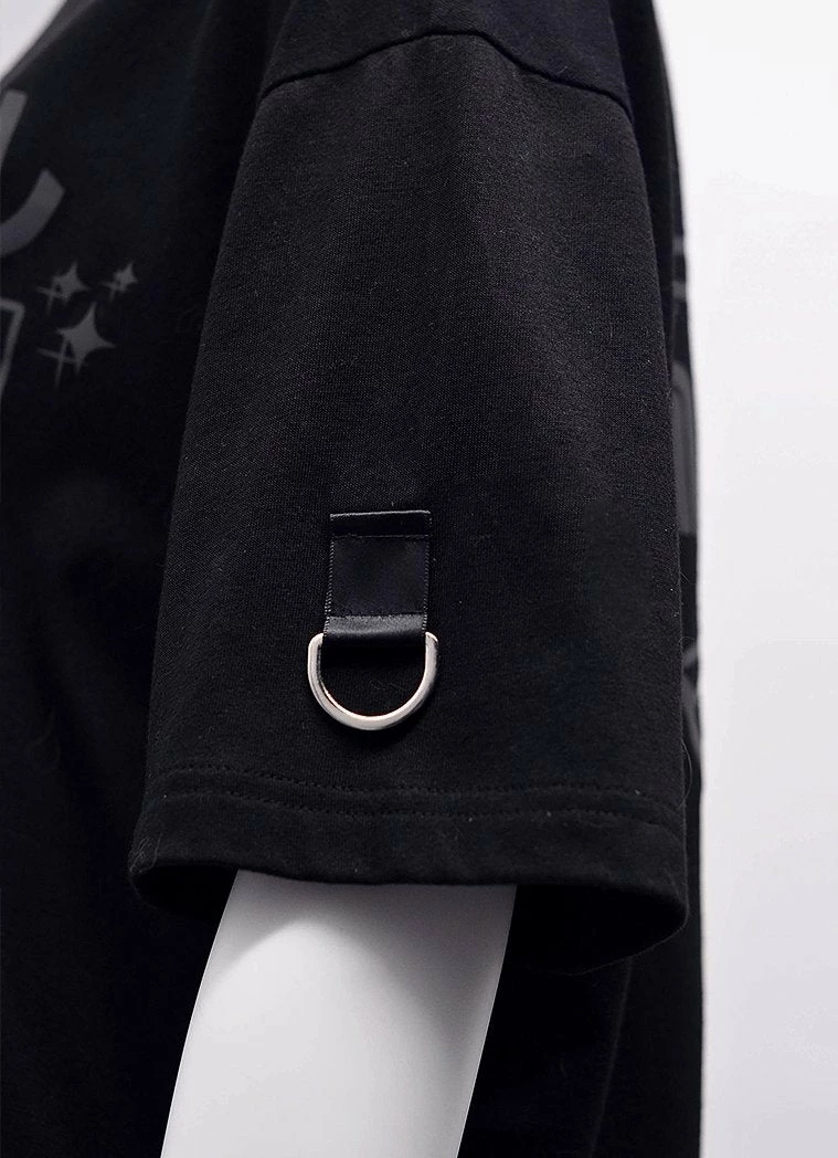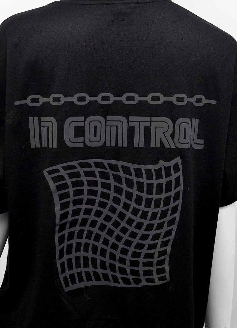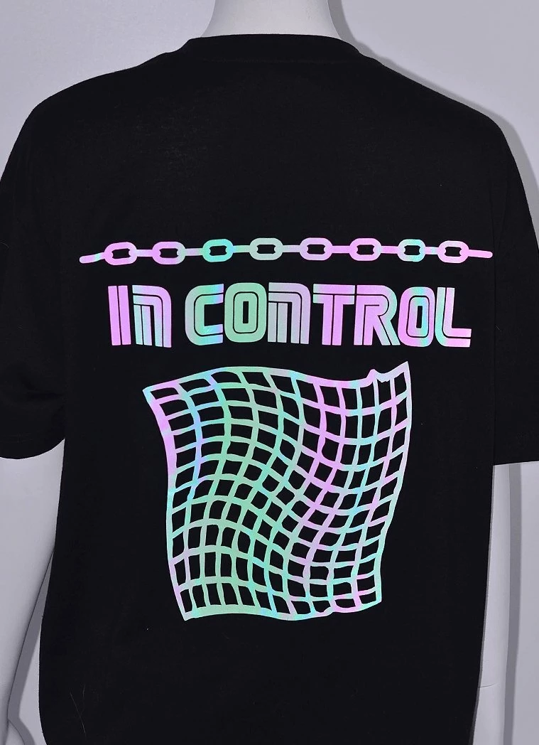 - Main design includes a colorful image of a woman on the front, a ring loop decal on each sleeve, and a grid-like pattern on the back with the text “In Control”