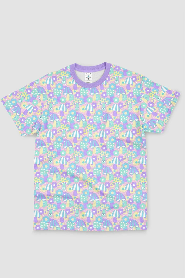 Adorable all over print pink shirt with cute colorful pastel dreamcore mushrooms. Super soft made of a polyester and spandex blend. These cool and cute t-shirts are perfect for any occasion, whether you are going to the club or just hanging out with friends. Made of a blend of polyester and spandex.