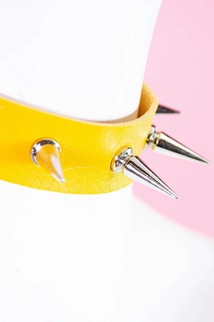 One big ray of sunshine but with a twist. This choker necklace is 17″ Long and has adjustable straps .Featuring sliver spikes details around the collar.