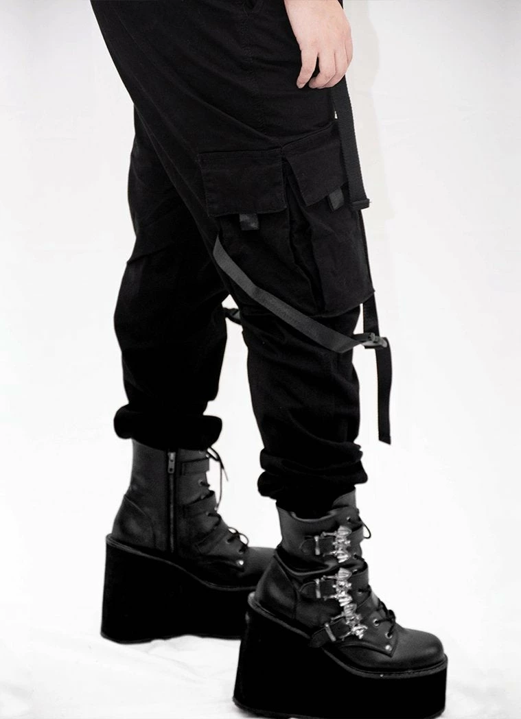 Designed with both comfort and style in mind, our Unknown Zone Strap Pants will quickly become your go-to pants, transitioning effortlessly from day to night. The buckle strap detail gives that techwear aesthetic along with functional pockets. These pants are made of cotton and spandex.