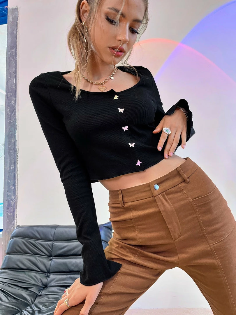- Features: Slit cuffs, long sleeves, butterfly-shaped buttons, knit, cropped